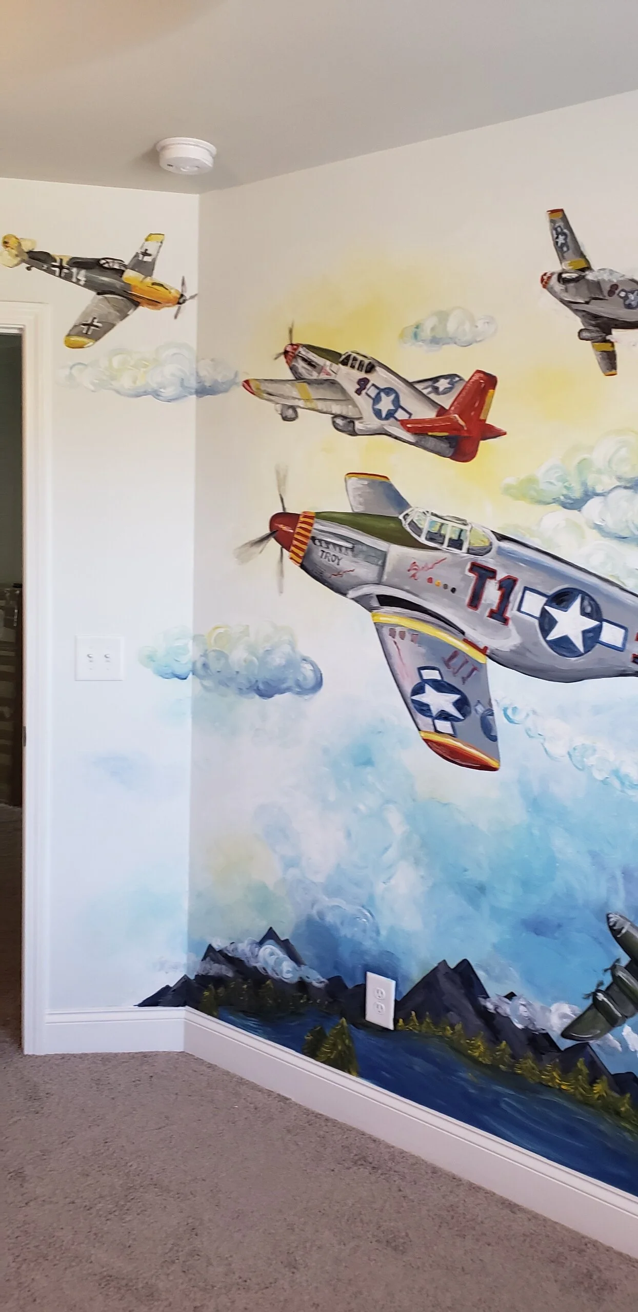 Located in the bedroom of a sweet little boy, this mural captures an interest in the planes of WWII. Special techniques were used to create a watercolor effect in the background. Because of this effect, a base background color wasn’t needed, and there were no harsh edges to the outline of the mural. It almost seems to fade out into the other walls. This mural captures an energetic plane chase, but in a way that is calm enough for a child’s bedroom.