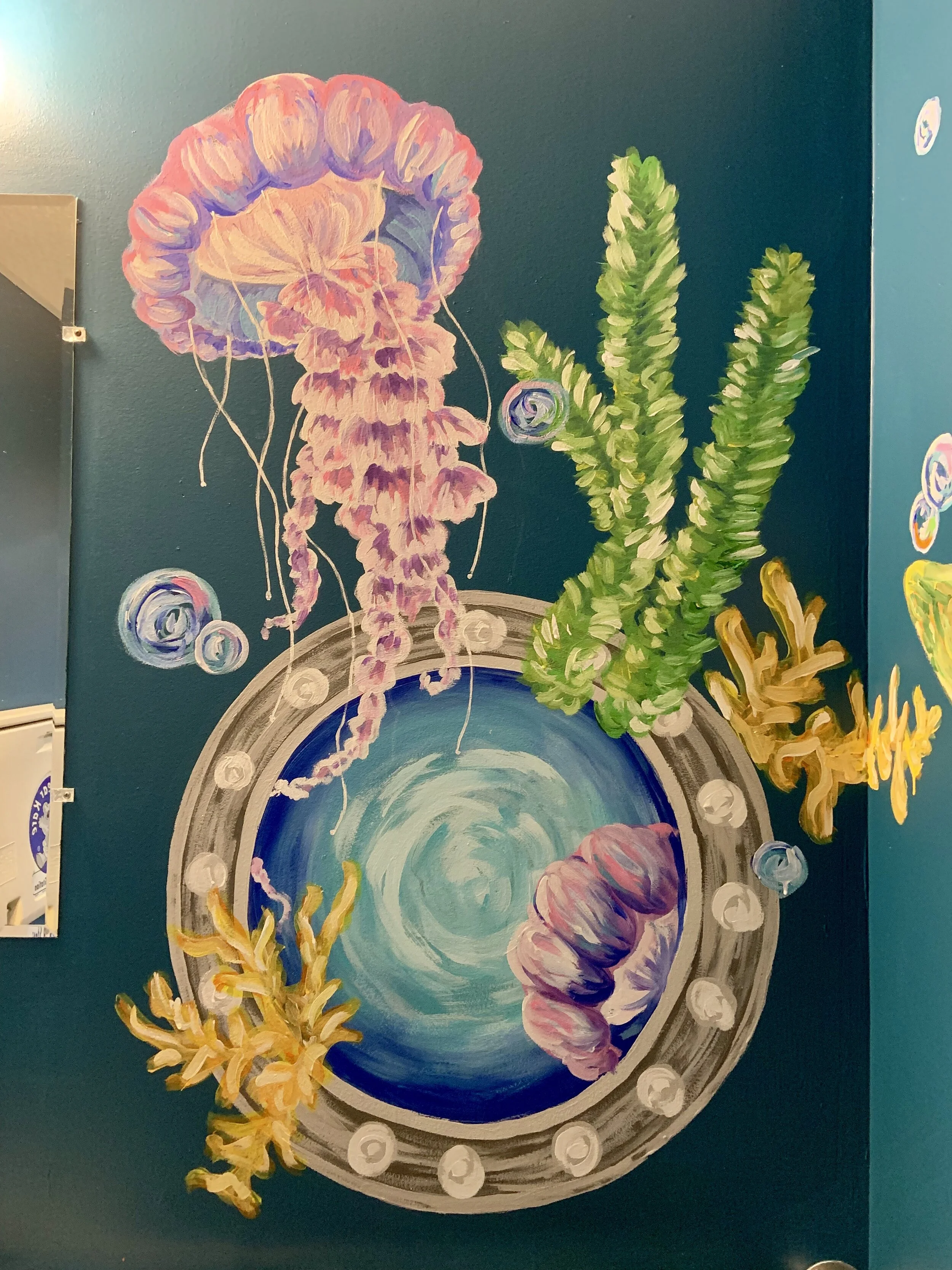 What does every toy store bathroom need? A magical mermaid experience. This ordinary bathroom was transformed with a fun and colorful mural. Dimension was added to the wall by having sea creatures both behind and in front of the submarine windows. The result is an enchanting experience for children who are surprised and excited to be greeted by jelly fish, sea turtles, and even a mermaid as they enter the bathroom.